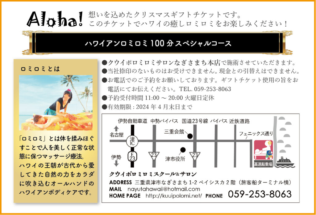 クリスマスだけでなく、あなたの大切な人のお祝いやなにかの節目に、健康と元気、そして爽快な明日をプレゼントするロミロミマッサージのギフトチケットです。