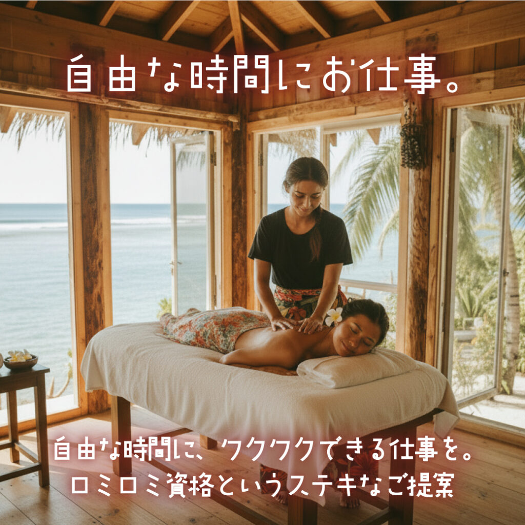 「副業で収入を増やしたい」「将来に向けて手に職をつけたい」「いつかは自宅で開業したい」 —— こういう方に選ばれているのが、ハワイ伝統の癒しの技術「ロミロミ」です。 この記事では、ロミロミが副業・開業に強い理由、収入の目安、未経験から学ぶ方法、そして「スクール選びで失敗しないポイント」まで、具体的に解説します。
