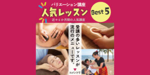 【人気レッスンのご紹介】バリエーション講座 最近6か月間(昨年10月~今年3月)に受講が多かったロミロミレッスン「Best 5」をご紹介します! 受講生の皆様は肌で流行を感じて受講メニューを決められます。つまり、受講の多 … 続きを読む バリエーションロミロミ講座|受講人気Best5(2025年10月~2026年3月)