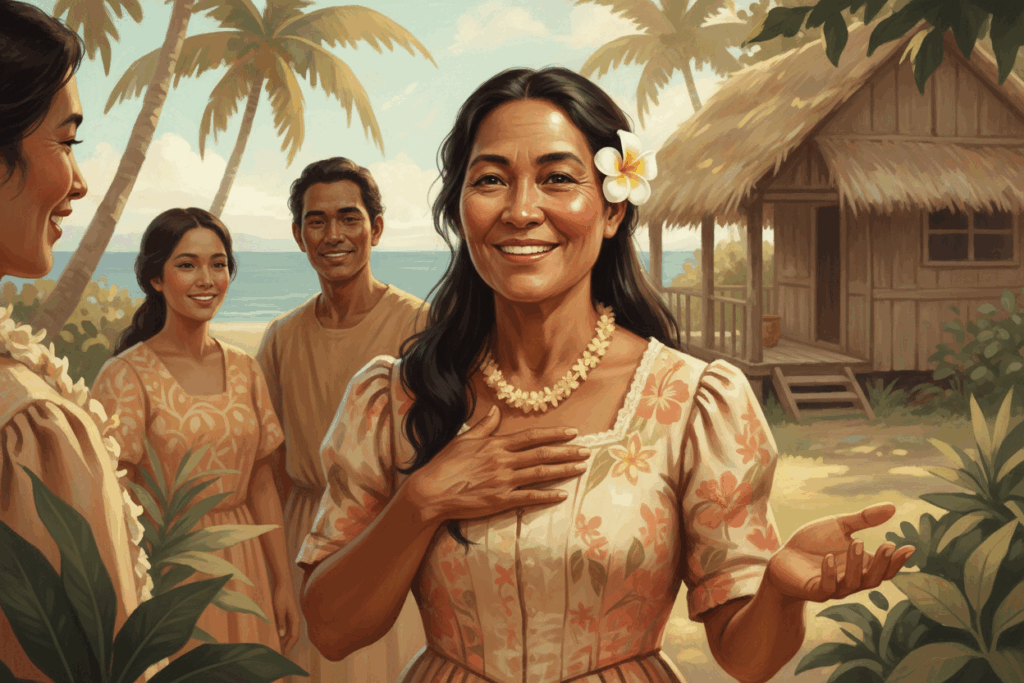 (Dane Kaohelani Silva, 2000, p.90)「私には子供時代から毎週日曜日にはオハナデー(家族の日)があった。それは義務的であったが、誰も決してそのようには言わなかった。オハナのすべての子供や孫たちが祖母のもとに集まった。それはとても自然なことだった。私たちは2時くらいに祖母の家に行った。祖母はすべてを取り仕切っていた。彼女は年長者から若者まで、すべてのオハナが座るテーブルを回り、一人一人に「この一週間はどうだったの?」と尋ねる。そして何か特別なことがあった時には、彼女が話を聞くのだ。」