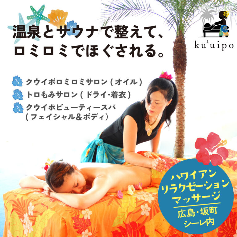 クウイポロミロミ広島シーレ店は、JR坂駅前の天然温泉施設「アジアンリゾートスパ・シーレ」内にあります。