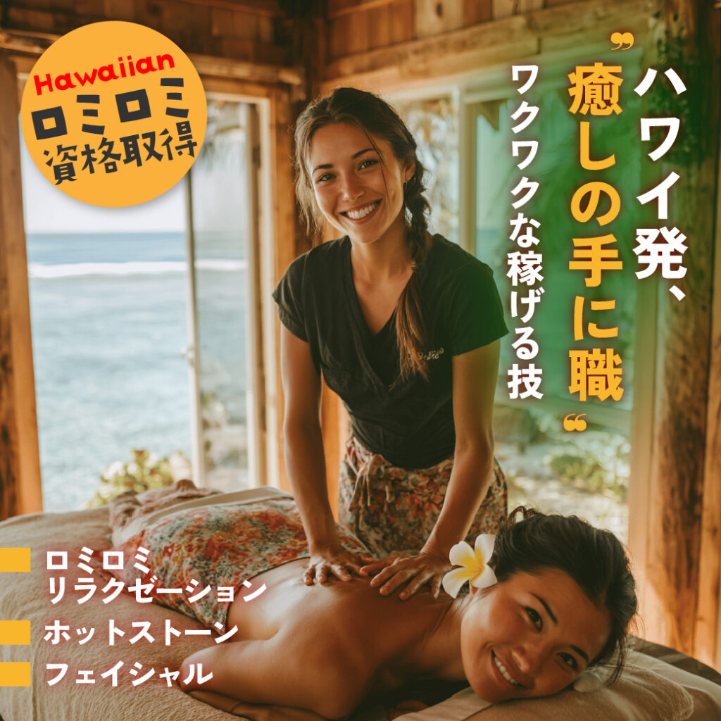 信頼される仕事ロミロミは、心身をやさしく整えるハワイ発のボディワーク。コリや疲れを和らげるだけでなく、安心感や前向きさを引き出します。「あなたにお願いしたい」と指名される、感謝がダイレクトに届く天職です。