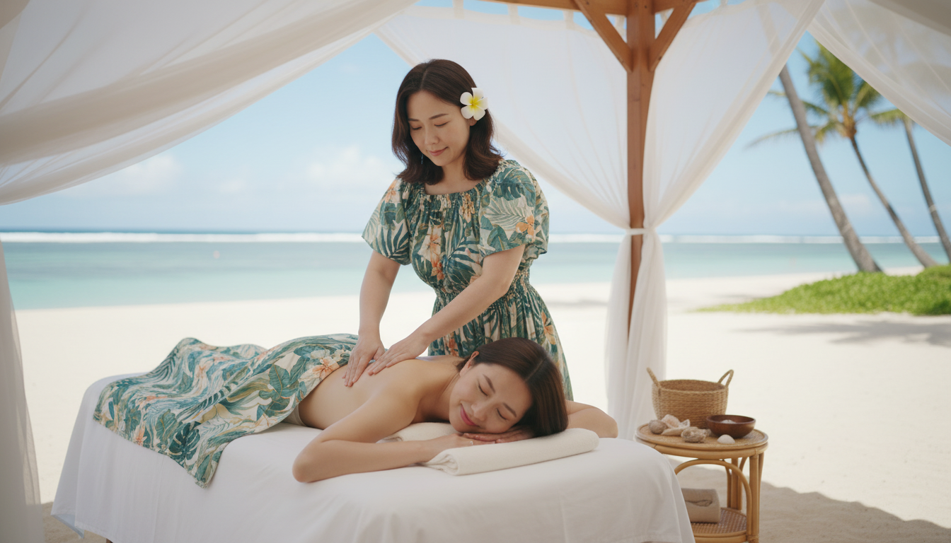 南の島の浜辺でロミロミ施術を行い、お客様が幸せそうに受けている様子