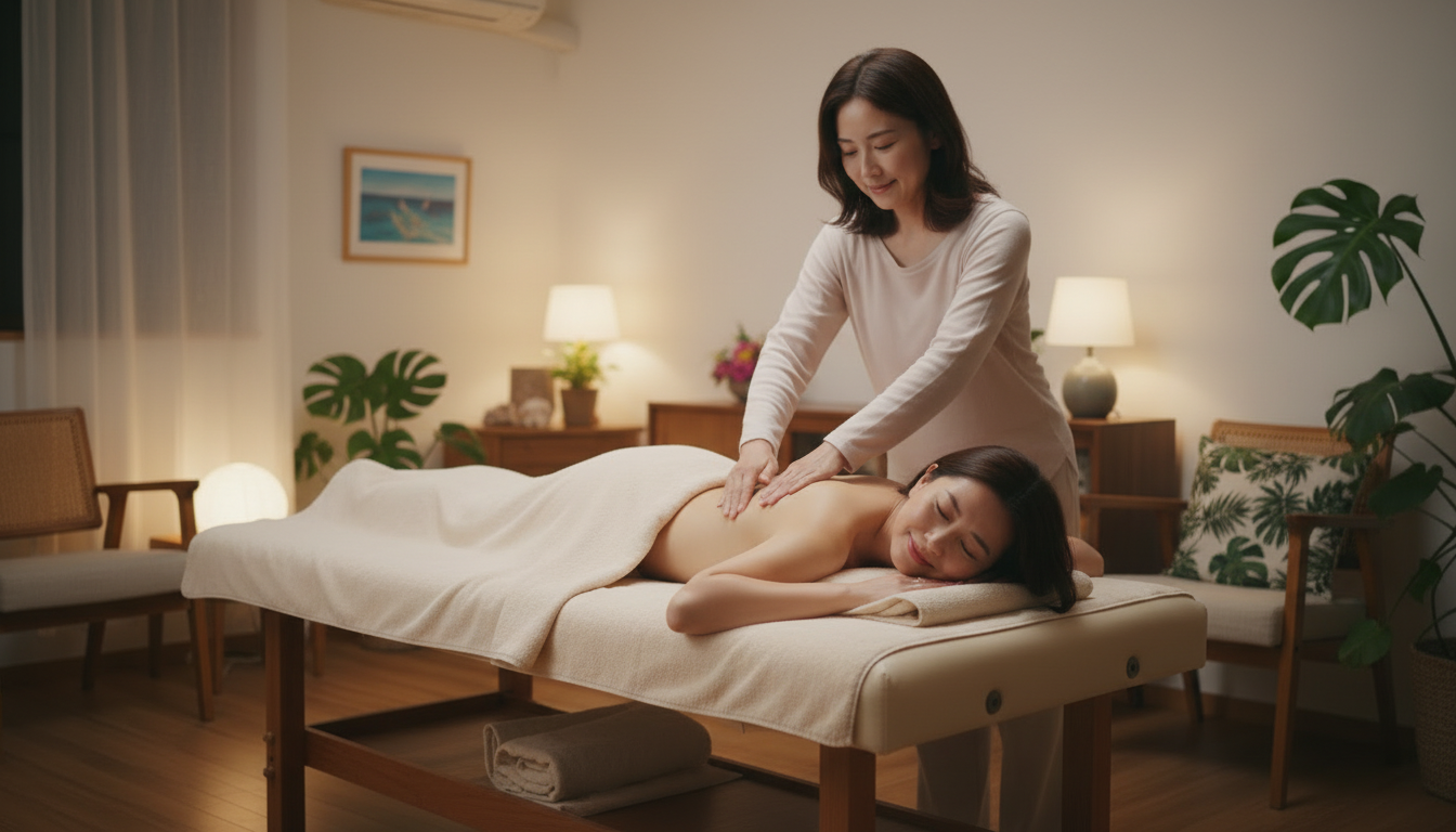 ハワイアンな雰囲気のサロンでロミロミ施術を行い、お客様が幸せそうに受けている様子